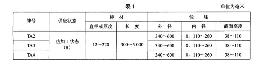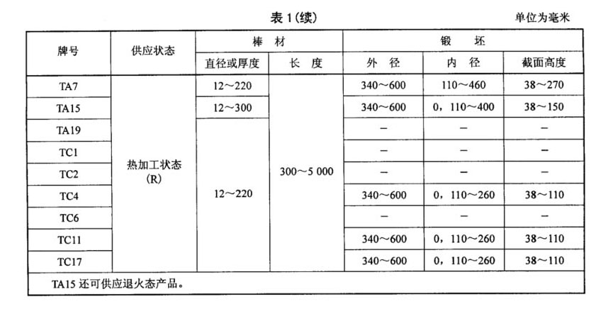 棒材和鍛坯牌號、狀態和規格應符合表1的規定。其中TA15鈦合金棒材根據用途分為兩個類別: