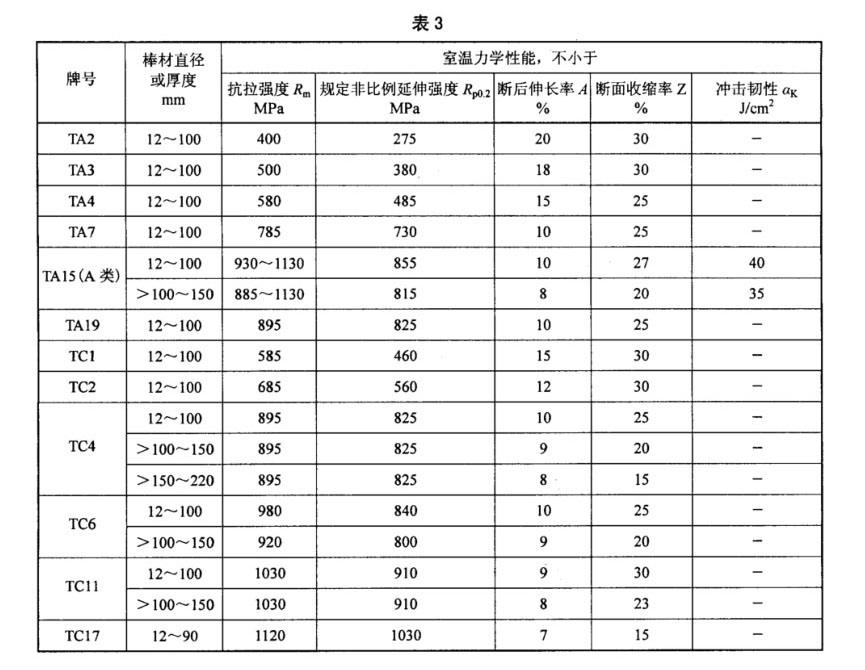 3.4.2 棒材的室溫力學性能應符合表3的規定,鍛坯的室溫力學性能應符合表4的規定,超出表中規格范圍的棒材或鍛坯的室溫力學性能由雙方協商確定。