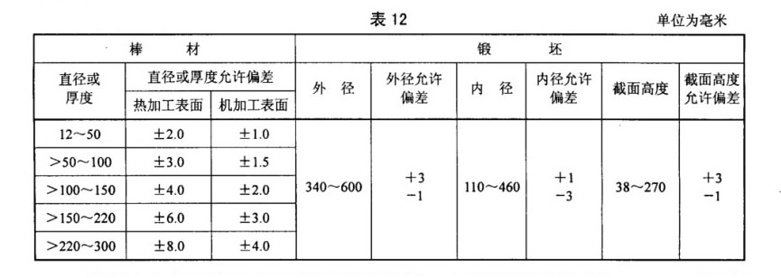 3.7.1 棒材和鍛坯以磨削或機加工表面供貨。當訂購方要求并在合同中注明時,棒材也可以熱加工表面供貨。棒材和鍛坯的尺寸允許偏差應符合表12的規定。